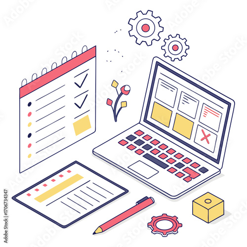 Isometric illustration of a laptop with a to do list calendar and planning documents representing project management and task completion with gears symbolizing efficiency and workflow