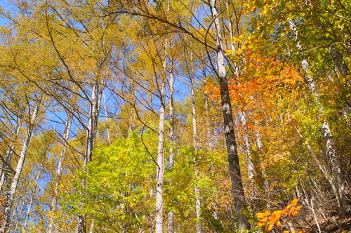 Japanese autumn forest and dam lake