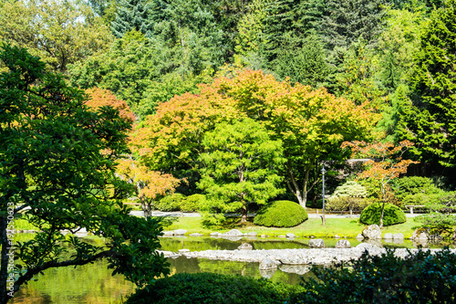 autumn, bush, colours, fall foliage, japanese garden, landscape, lily pad, outdoors, park, path, duck pond, seattle, stroll, tree, washington, water