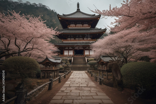 japanese temple and cherry blossom Generative AI