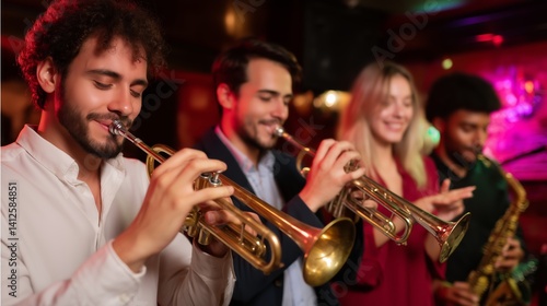 Jazz band performs lively music in dimly lit venue during an energetic night of celebration