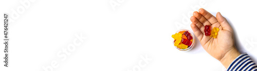 candy, jelly, bear, children, children, hand, gummy, isolated, white, sweet, eat, red, food, orange, children, colours, colourful, sugar, snack, yellow, treat, sugary, background, children, deliciously, gum, tasty, green, fruit, dessert, delicious, vitamin, unhealthy, texture, healthy, confectionery, pharmacy, concept, childhood, medicine, organic, little, chewy, capsule, calorie, hold, give, copy space, banner