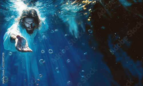 Jesus Christ Giving Helping Hand Underwater Scene