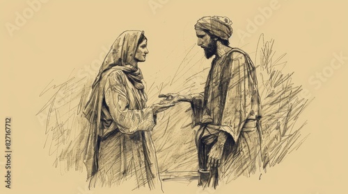 Jesus with Woman at Well, Telling Her About Living Water, Biblical Illustration, Beige Background, Copyspace