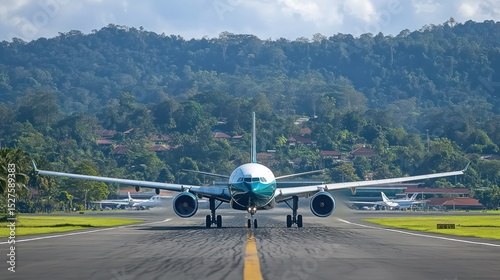 aeroplane, jet, runway, aerodrome, travel, flight, passenger, commercial, tour tourism, vacation, destination, transport, aviation, aircraft, traveler, journey, flying, landscape, mountain, tree, nature, green, summer, sunshine, beautiful, view, transportation, departure, arrival, smooth, fast, speed, efficient, modern, large, powerful, engine, wing, airliner, horizon, scenic