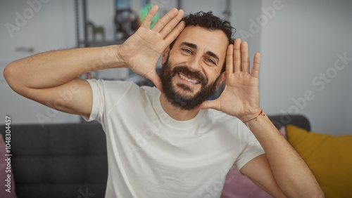 man, beard, smiling, home, joyful, indoor, middle-aged, gesture, modern, living room, adult, happy, male, casual attire, interior, lifestyle, relaxed, photogenic, cheerful, fun, expression, white, comfortable, person, enthusiasm, joy, laughing, furniture, content, positive, room, playful, sofa, couch, t-shirt, mature, emotion, enjoyment, recreation, portrait, genuine, well-being, merriment, carefree, satisfaction, entertaining, amusement, humor