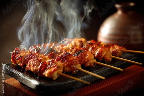 yakitori, skewer, chicken, grilling, smoke, food, cooking, traditional, delicious, eatery, favor, herb, spice, bar-b-q, savoury, culinary, meal, dining, appetising, roast, epicure, kitchen, asian cuisine, presentation, tender, aromatic, temperature, receipe, ingredient, crispy, evening, atmospheric, culture, rustic, culinary arts