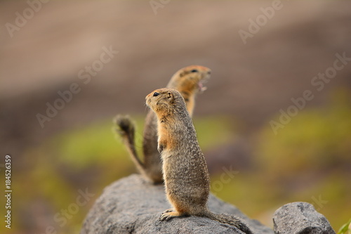 Kamchatka gopher stands on a stone, a Far Eastern rodent, feeding a large gray hamster nuts on an Avacha volcano, close up portrait