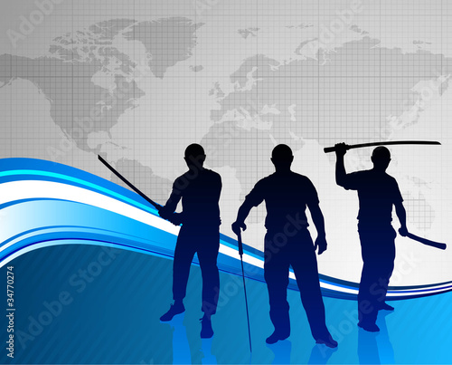 earth, map, europa, asia, africa, australia, america, sword, sharp, blade, cut, stab, silhouette, sensei, fight, defense, background, training, ninja, karate, weapon, dangerous, skill, muscular, competition, master, professional, teacher, event, design, bright, vibrant, shiny, high-coloured, vector, illustration, abstract, blue, wave