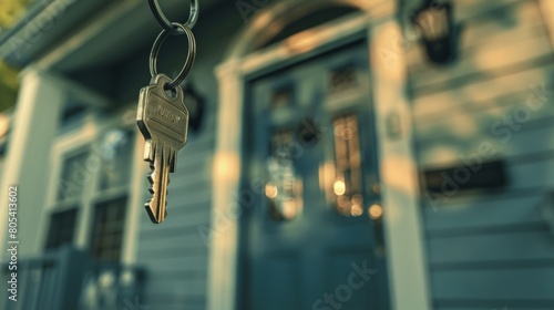 key showing key from new house rented leased purchased apartment, Moving house, relocation. New house, belongings and furniture. move in the apartment or condominium. New landlord, Becoming homeowner