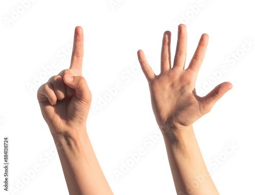 Kids childs hand counting one and five with little fingers isolated. Gestures for quantity, white background., transparent PNG