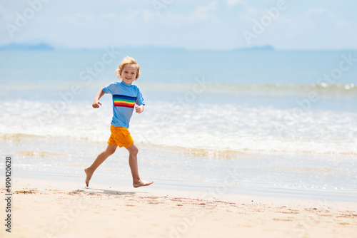 Kids playing on beach. Children play at sea.