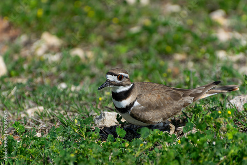 plover, bird, wildlife, ground, brown, black, white, stripes, eye, beak, feather, pretty, beautiful, cute, greengrass, nature, avian, animal, migratory, nesting, watching, looking, closeup, up close, clover, rocky, rock, eye, noisy, standing, alert, curious, nest, striped, camouflage, colours, marking, distinctive, small, tiny, spring, summer, weed