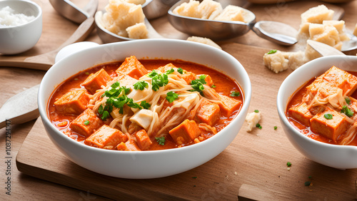 Kimchi jjigae with visible chunks of kimchi and tofu