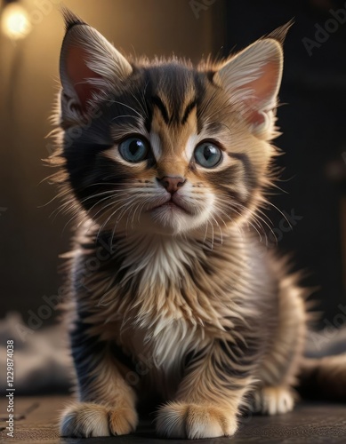 Kitten's soft fur blends with dark surroundings, softness, shadows
