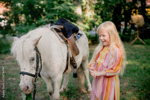 kleines blondes Mädchen, das ein Pony füttert