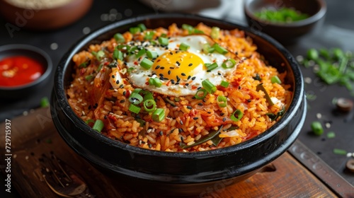 Korean Kimchi Fried Rice Also known as kimjib geumbap, it is served on a plate with smoke rising gently. Reminiscent of the aroma of freshly prepared deliciousness.