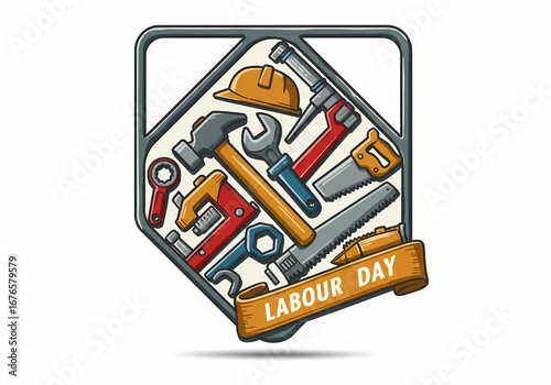 labour day, tool, hammer, wrench, saw, plier, construction, trade, carpenter, mechanic, men at work, craft, skill, celebration, holiday, graphic, design, illustration, retro, vintage, metal, frame, diamond, banner, greeting, card, digital artwork, vector, artwork, shopkeeper, working man, labor, industry, craftsmanship, hand tool, repair, building, construction worker, maintenance, anniversary, commemoration, celebratory, design element, graphic design