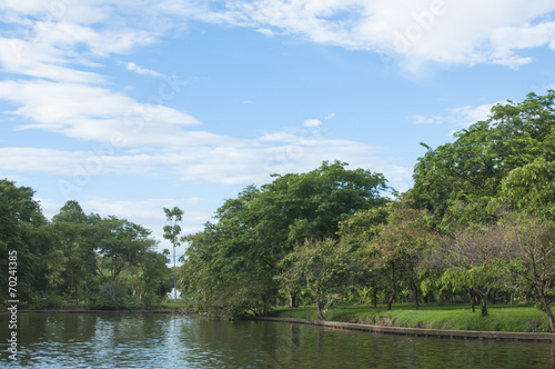 lake, park, duck pond, wood, river, bush, tree, meadow, lawn, grass, summer, sky, water, foliage, nobody, green, travel, silence, day, life, leaf, season, forest, blue, plant, terrain, rural, outdoors, nature, environment, tranquil, vacation, purity, landscape, relaxation