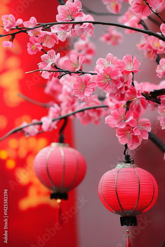 chinese, lantern, interior, decoration, flower, tree, spring, blossom, nature, pink, tree branch, cherry, flower, bloom, blooming, plant, apple, garden, sakura, beauty, season, flora, floral, red, leaf, bud, sky, peach