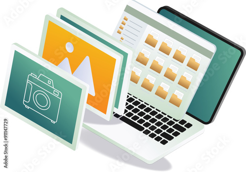 Laptop with camera, folder, and computer items on desk