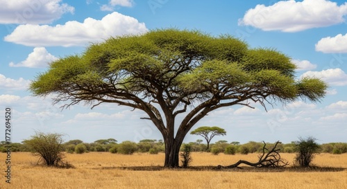 Large acacia tree dominates dry savanna under blue sky with clouds.