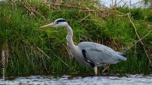Large Grey Heron, Ardeidae, Single Bird Close Up, eyeline low angle view, searching for food on riverbank