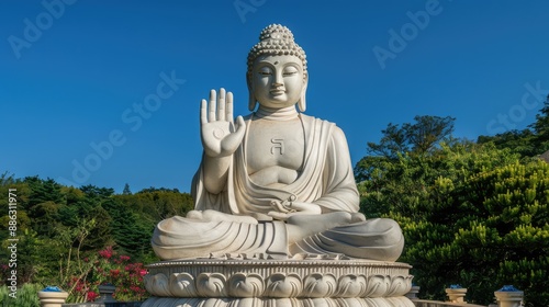 buddhism, religion, spirituality, meditation, statue, sculpture, marble, white, large, lotus, position, hand, raised, blessing, gesture, serene, peaceful, calm, tranquil, holy, sacred, spiritual, divine, nirvana, wisdom, compassion, love, kindness, mercy, forgiveness, patience, tolerance, acceptance, peace, harmony, balance, oneness, truth, reality, nature, beauty, serenity, calmness, bliss, happiness, joy, contentment, fulfillment
