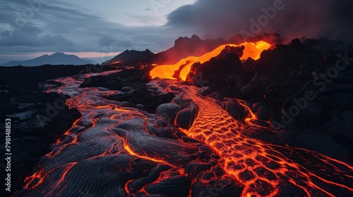 volcano, nature, mountain, cloud, fire, sky, heat, lava, flames, smoke, sunset, landscape, eruption, flowing, molten, magma, hot, fiery, geologic, geology, natural, scenic, dangerous, destructive, intense