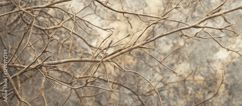 Leafless tree twigs in a muted background showcasing intricate patterns of dry branches during autumn or winter season.