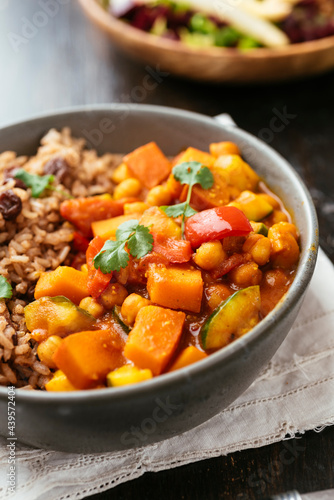 bell pepper, bowl, chickpea, chickpea, cinnamon, coriander, delicious, dinner, dish, food, freshness, healthy, homemade, homemade, indoor, meal, nobody, ready-to-eat, rice, squash, stew, traditional, vegan, vegetable, vegetarian, courgette