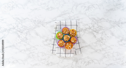 almond, baking, cake, cream, cupcake, dessert, food, frosting, nut, pastry, snack, sweet food, sweet, icing, overhead, paper, pastry, silicon, topview