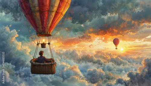 light, bulb, hot, air, balloon, basket, person, inside, rising, turbulent, storm, cloud, sunrise, background, whimsical, watercolor, style, illustration