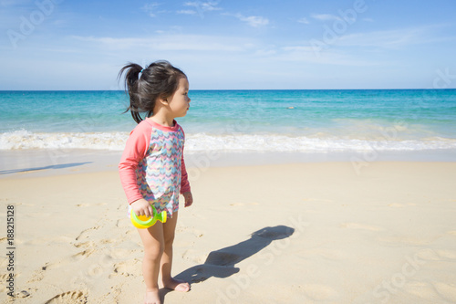 Little asian girl playing on beach.Vacation summer and relax concept.
