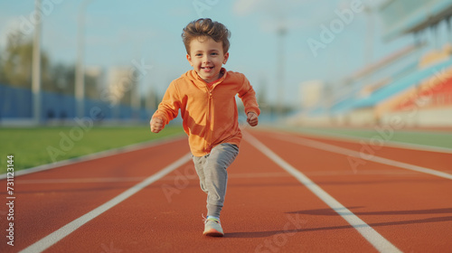 Little child running filled with joy and energy running on athletic track, young boy runner training on the stadium. Concept of sport, fitness, achievements, studying