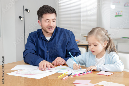 Little girl drawing during lesson with teacher at desk indoors