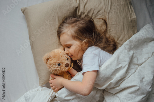 Little girl sleeping in bed embracing soft toy at home, top view