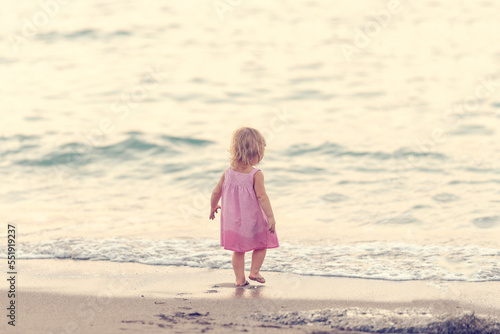 Little girl walking on the shore. Perfect day at the sea. Toddler in a pink dress plays by the sea