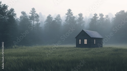 house, cabin, forest, tree, fog, mist, field, grass, meadow, morning, dawn, sunrise, light, window, dark, lonely, secluded, remote, tranquil, peaceful, serene, quiet, mysterious, magical, mystical, wood, nature, landscape, scenery, environment, rural, countryside, solitude, isolation, stillness, calm, dreamy, aethereal, atmosphere, ambience, mood, shadow, silhouette, illumination
