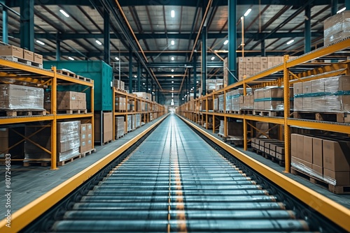 Long conveyor belt flanked by yellow shelves stacked with boxes in a warehouse