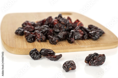Lot of whole sweet dried cowberry................ on bamboo cutting board isolated on white background