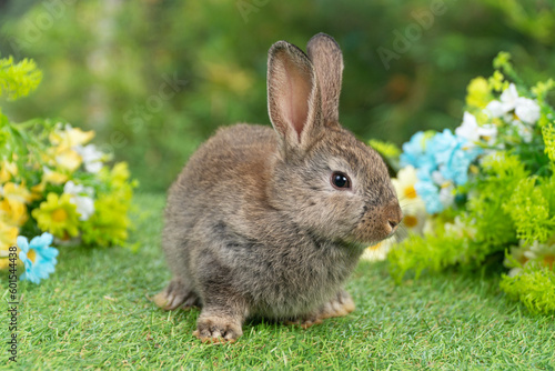 Lovely rabbit ears bunny sitting playful on green grass with flowers over spring time nature background. Little baby rabbit brown bunny curiosity standing playful on meadow summer background. Easter