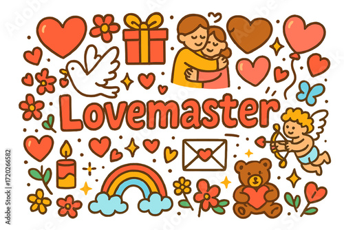 Lovemaster Doodle Extravaganza. Lovemaster. Hand-drawn doodle illustration of Lovemaster. hearts, flowers,
