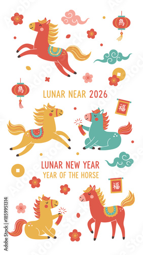horse, lunar, new, year, 2026, celebration, chinese, zodiac, animal, equine, equestrian, mammal, mythical, traditional, culture, asian, festive, holiday, decoration, ornament, lantern, cloud, flower, blossom, red, yellow, teal, blue, pink, orange, gold, white, stylised, cartoon, illustration, graphic, design, vector, art, drawing, cute, playful, energetic, dynamic, jumping, running, standing, pattern, symbol