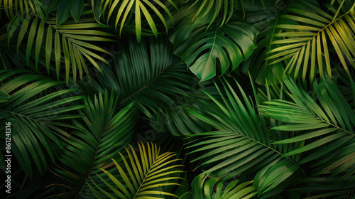 lush, dense arrangement of various green palm leaves. The overlapping foliage creates a rich, tropical texture with varying shades of green, providing a natural and exotic background