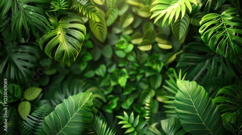 Lush green foliage with various tropical leaves creating a vibrant natural backdrop