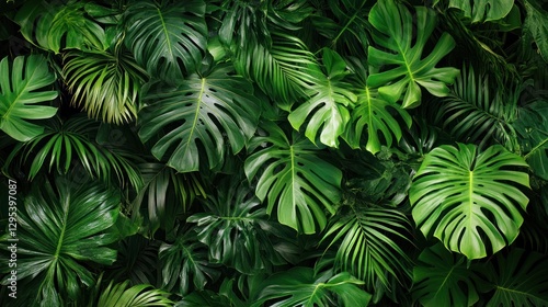 leaf, green, tropical, foliage, plant, jungle, background, nature, texture, pattern, monstera, palm, vibrant, lush, dark, shadow, rainforest, exotic, flora, botany, greenery, dense, growth, organic, natural, beauty, wilderness, colours, deep, rich, bright, summer, design, element, wallpaper, illustration, image, photo