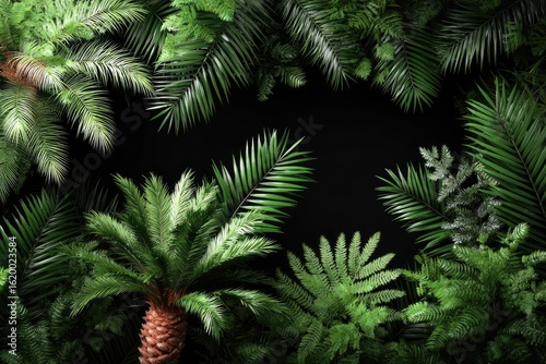 tropical, green, leaf, plant, palm, fern, jungle, nature, forest, black, background, frame, floral, fresh, vibrant, exotic, bold, pattern, design, decor, summer, spring, botanical, lush, dense, foliage, texture, high-coloured, natural, organic, beauty, composition, arrangement, detail, closeup, macro, top, view, dark, contrast, decorative, artistic, modern, contemporary