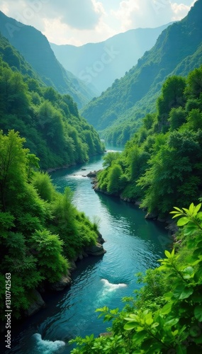 Lush green vegetation surrounds a winding river, serene landscape, foliage