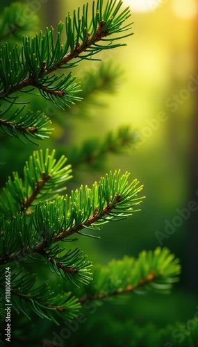 Lush pine branches in a warm glowing light on the pale green, peaceful, lush pine, nature